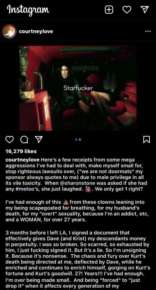 Entinen Nirvanan miekkonen ja nykyinen Foo Fighters -nokkamies Dave Grohl sai osansa someryöpystä, kun Love valitteli sitä, kuinka nainen aikoinaan luovutti rojalti-oikeudet Grohlille. Love kertoi, että hän oli niin rikkinäinen, arvilla ja puhki kaikesta, joten hänellä ei omasta mielestään ollut oikein muuta vaihtoehtoa.