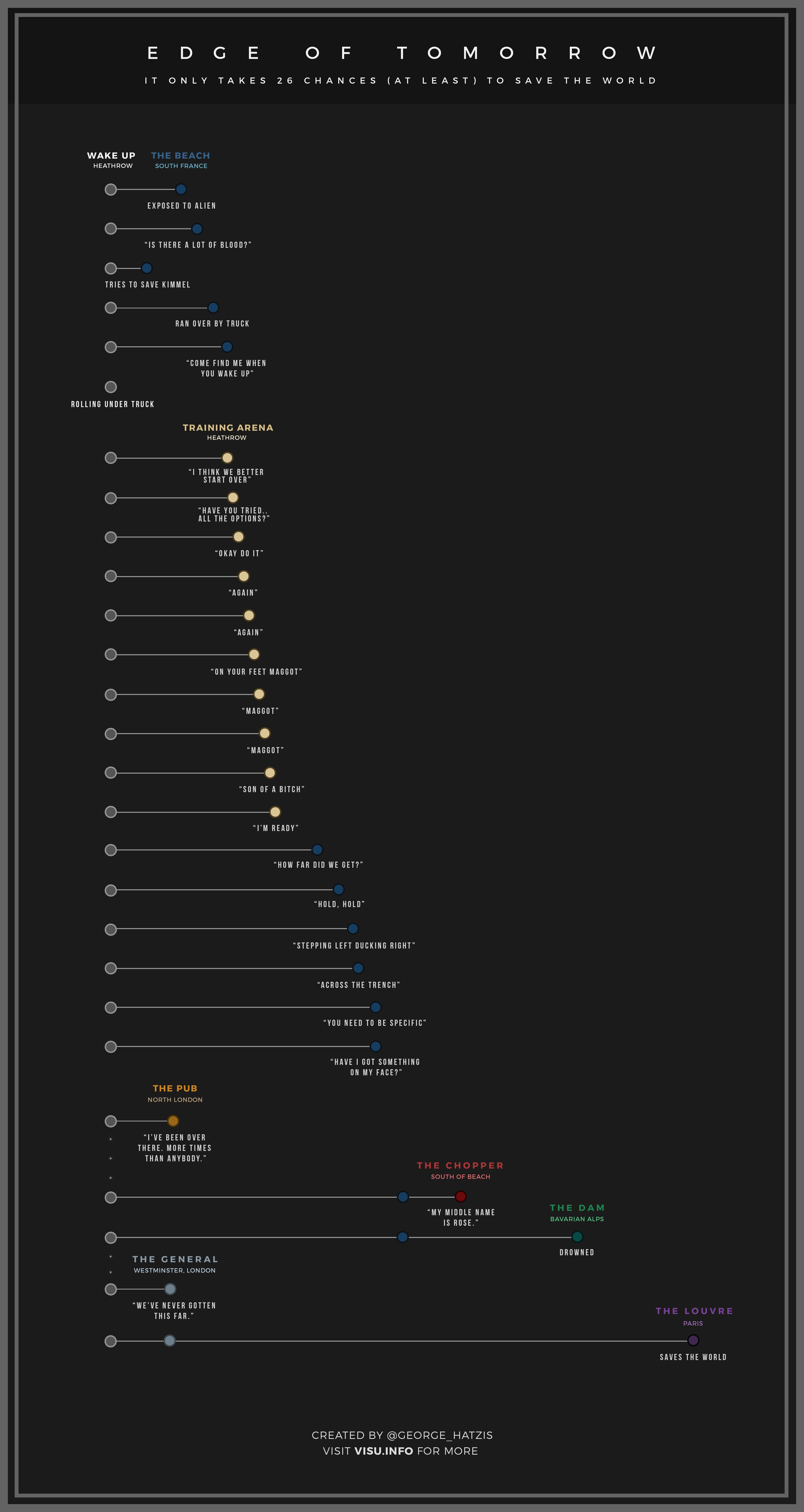 Elokuvassa Tom Cruise kuolee uudestaan ja uudestaan, palaten takaisin ajassa kuolinaamuunsa aina kuolemisen jälkeen. Nyt internetistä löytyi infografiikka, johon kaikki Cruisen kuolemat elokuvassa on listattu. Katso alta elokuvaa selkeyttävä kuva.