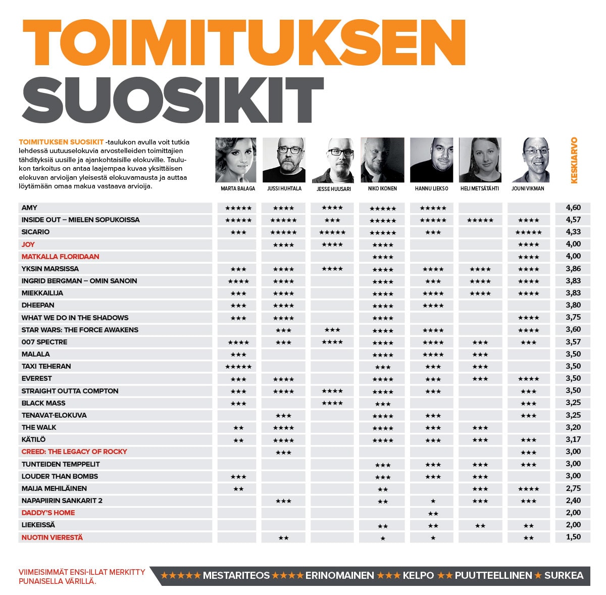 David O. Russell ei pettänyt Episodin toimituksen Jennifer Lawrence -faneja. Hänen Joy-uutuutensa nousi viikottaisessa Toimituksen suosikit -taulukossa vuoden 2016 ensimmäisen ensi-iltaviikonlopun tulokkaista (taulukossa punaisella) korkeimmalle. Sen rinnalle nousi toinen draamakomedia, haikea ranskalainen Matkalla Floridaan, jota kuitenkaan kovin moni ei vielä ollut ehtinyt nähdä.
