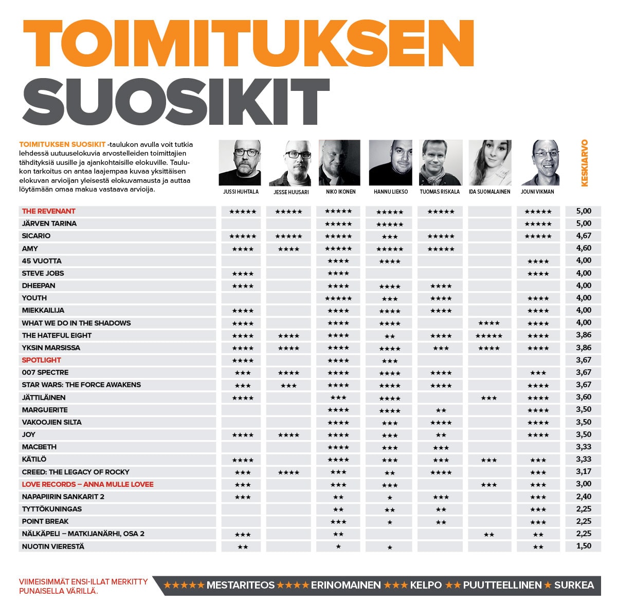 Hieman eri kokoonpanolla yleiseen mielipiteeseen olisi varmaan tullut säröjä – viimeistään silloin, kun yhä useampi avustajistamme on saanut elokuvat katsottua. Nautitaan kuitenkin hetki täydellisyyden illuusiosta. Uutuuksista The Revenant on tosiaan hurmannut Episodin toimituksen, ja todennäköisesti se tuokin Leonardo DiCapriolle tähteä kauan vältelleen Oscarin.