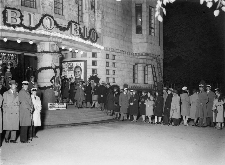 Pääsylippujono elokuvateatteri Bio-Bion edessä osoitteessa Heikinkatu 7 (nykyinen Mannerheimintie 5). Olof Sundström, 1930.